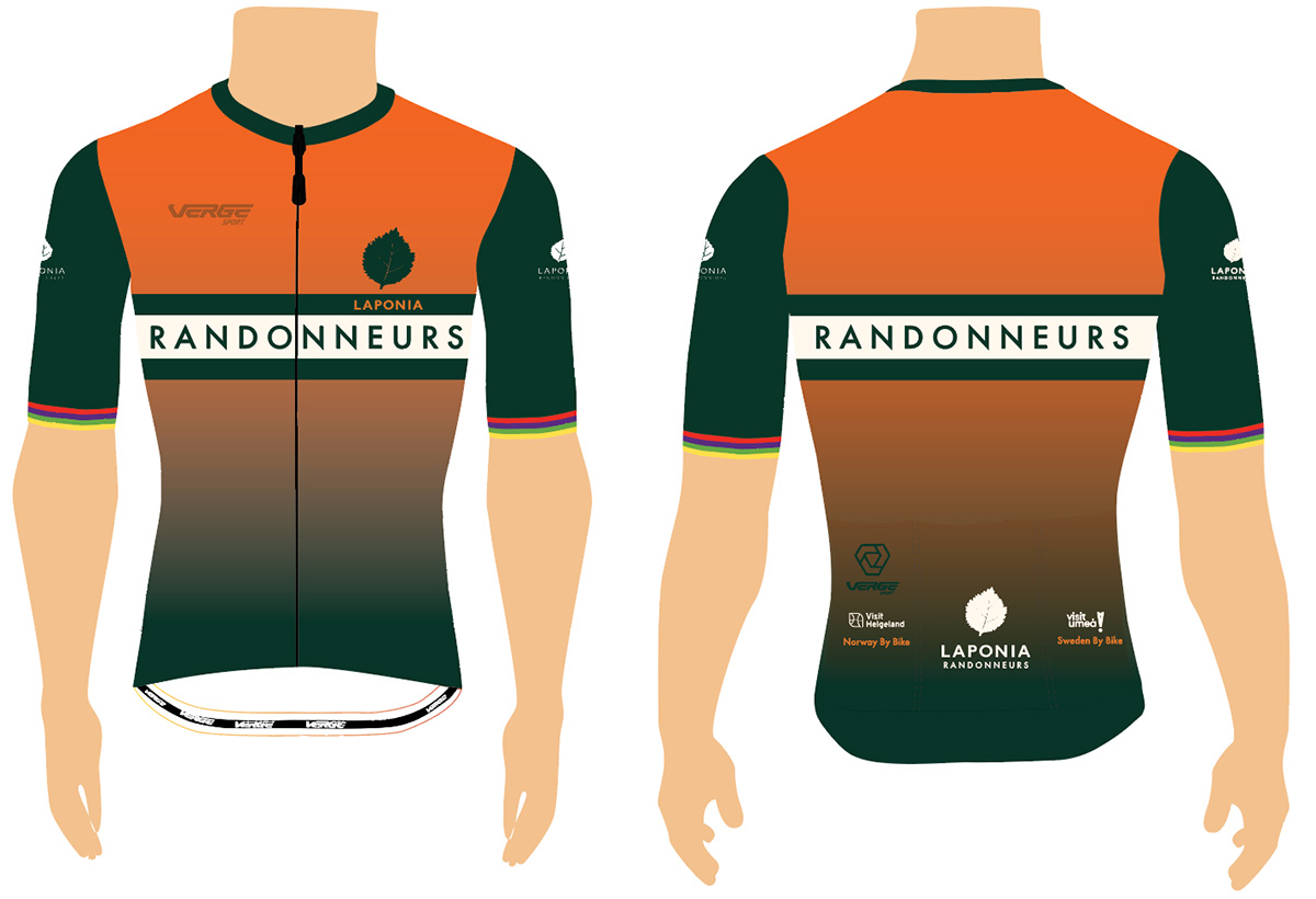The colour scheme of the Randonneurs Laponia cycling jersey is inspired by the cloudberry, native to the region. You don’t have to be a club member to buy the jersey, but the version with the extra coloured bands on the sleeves is only available to cyclists who complete the Randonneurs Laponias brevet series, which starts in May. See eBrevet calendar.