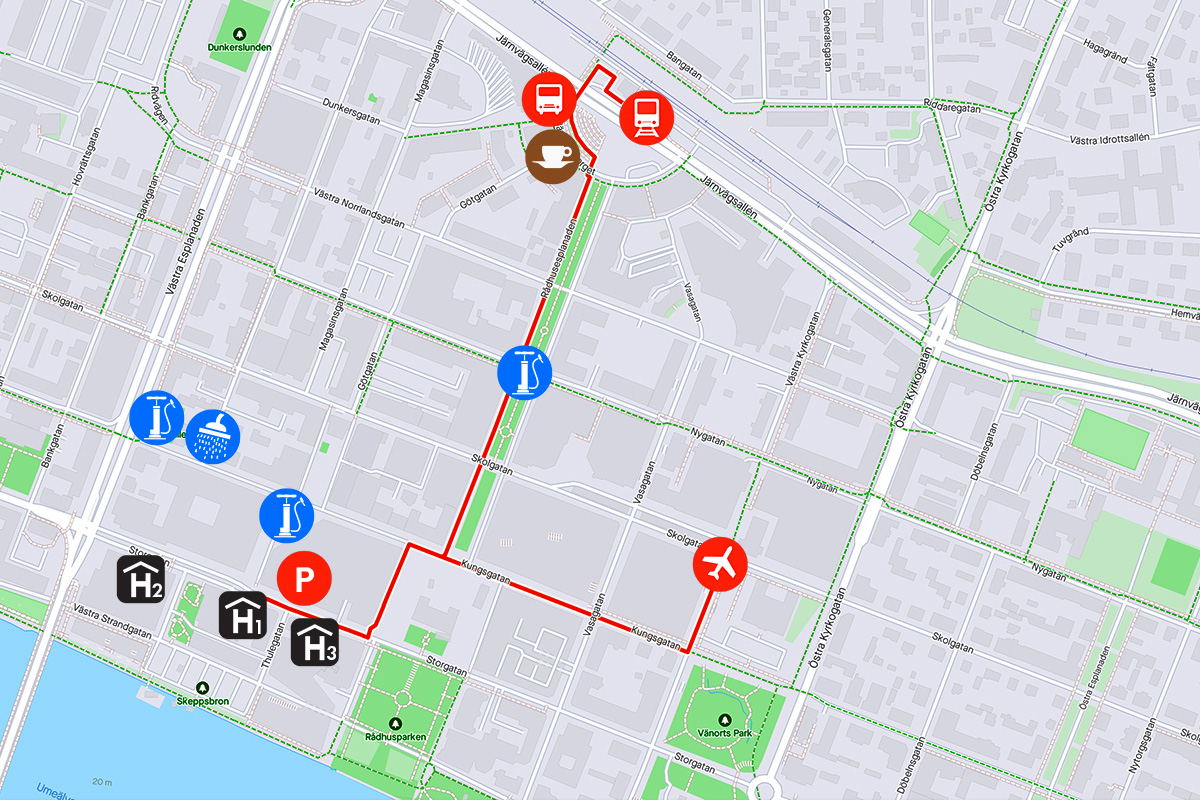 The event finishes at Scandic Plaza in the centre of Umeå. If you are staying at the hotel and arriving to Umeå by train you will have a ten minute walk (850m) through the town centre to the hotel. If instead you’re flying to Umeå and arriving by airport shuttle you’ll have an eight minute walk (600m) to the hotel from the bus terminal at Vasaplan. If you’re driving to Umeå and staying at one of the hotels below we recommend the parking garage Parketten on Storgatan 47.